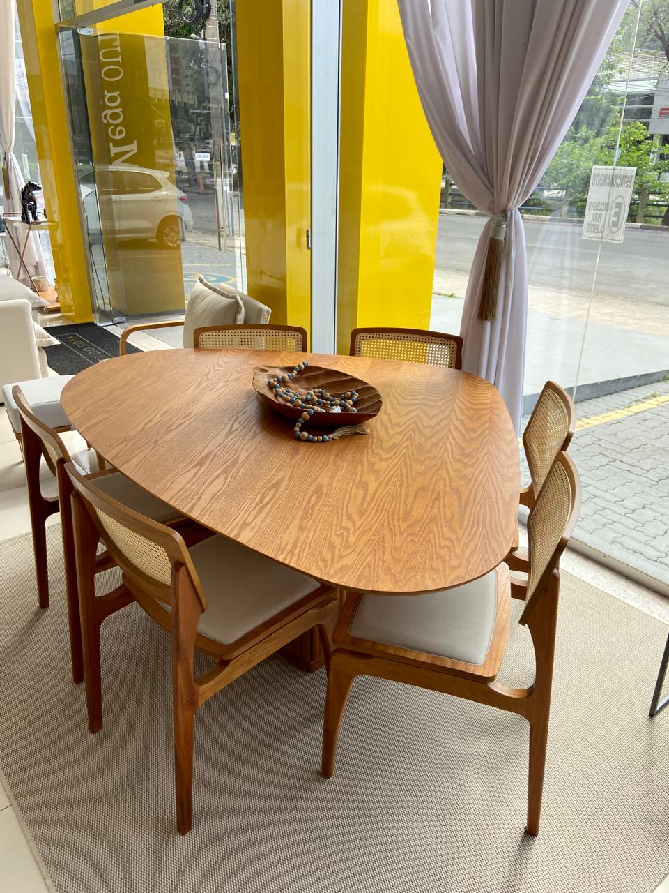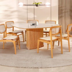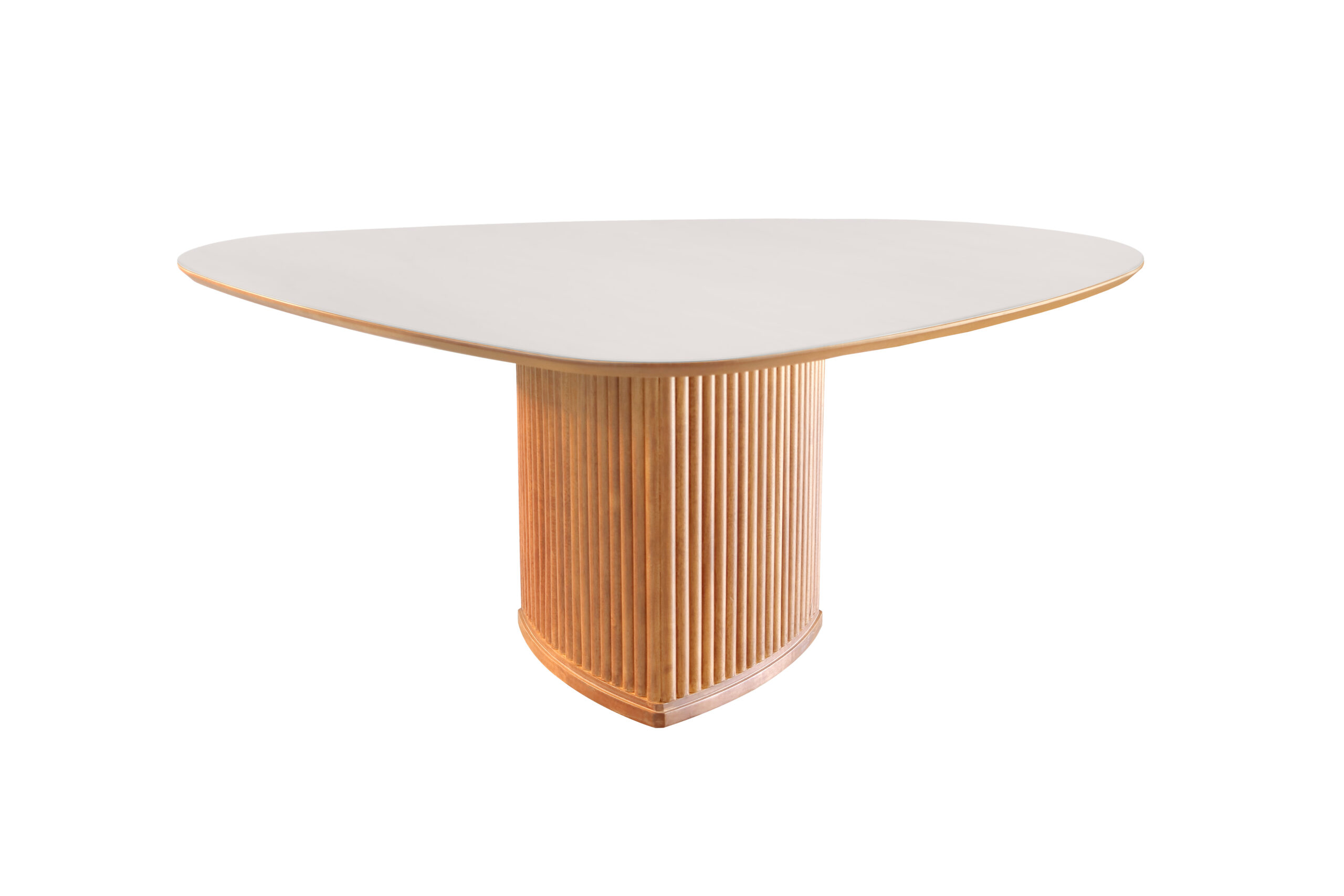 A Mesa Comores é a peça central perfeita para quem busca um design inovador, fugindo do tradicional. Seu formato orgânico triangular e a base escultural ripada criam um visual moderno e sofisticado, ideal para salas de jantar contemporâneas que valorizam a estética e a funcionalidade.