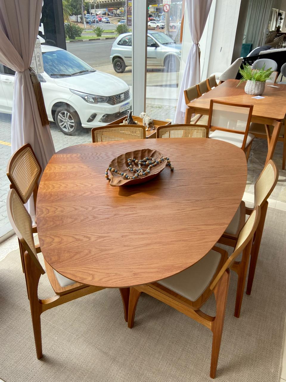 • Tampo Orgânico Triangular: O formato exclusivo e suave é visualmente agradável, otimiza o espaço e promove uma interação diferenciada entre os convidados, acomodando mais pessoas do que uma mesa retangular de mesmo comprimento.