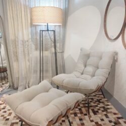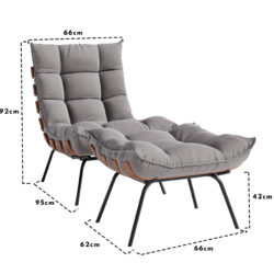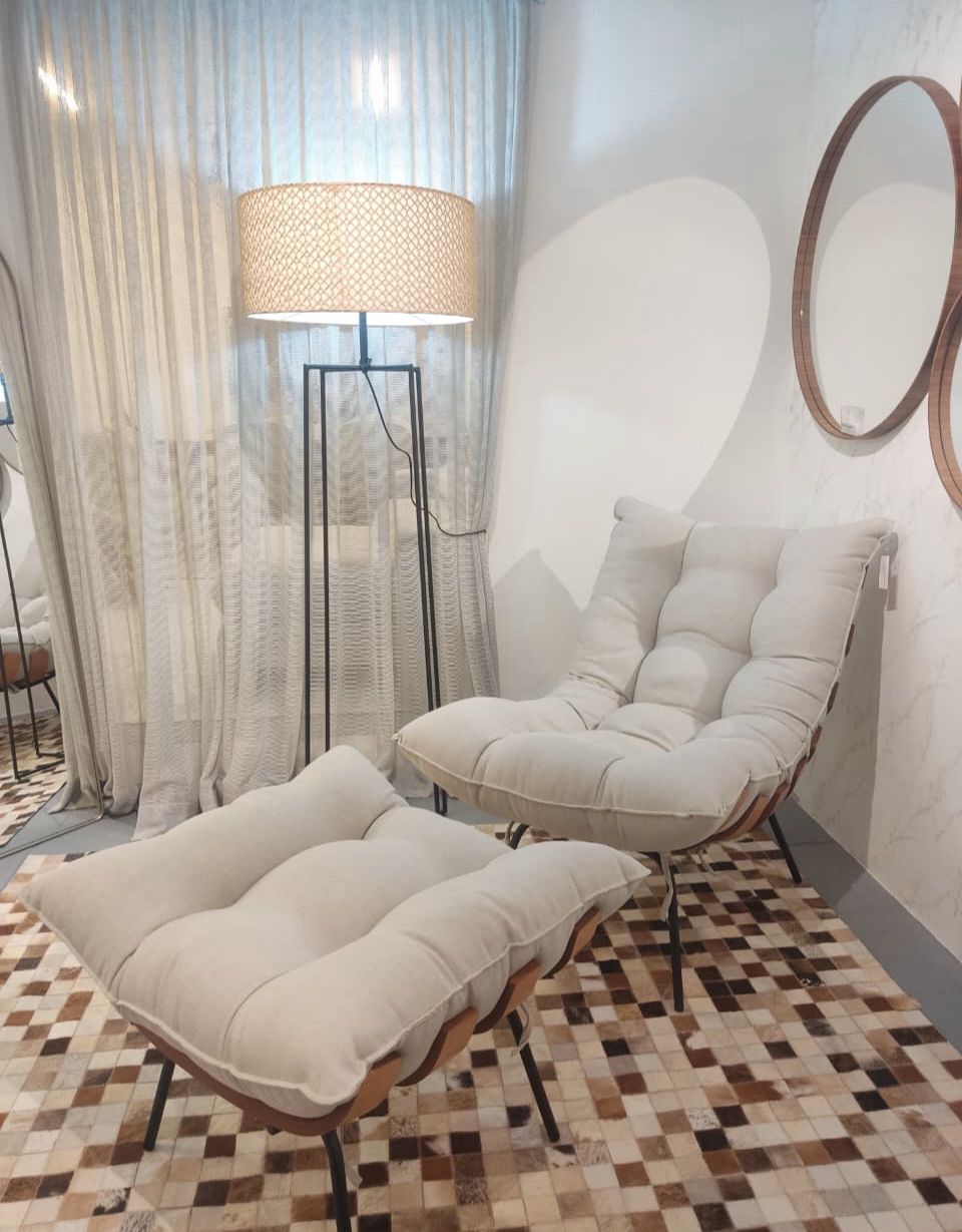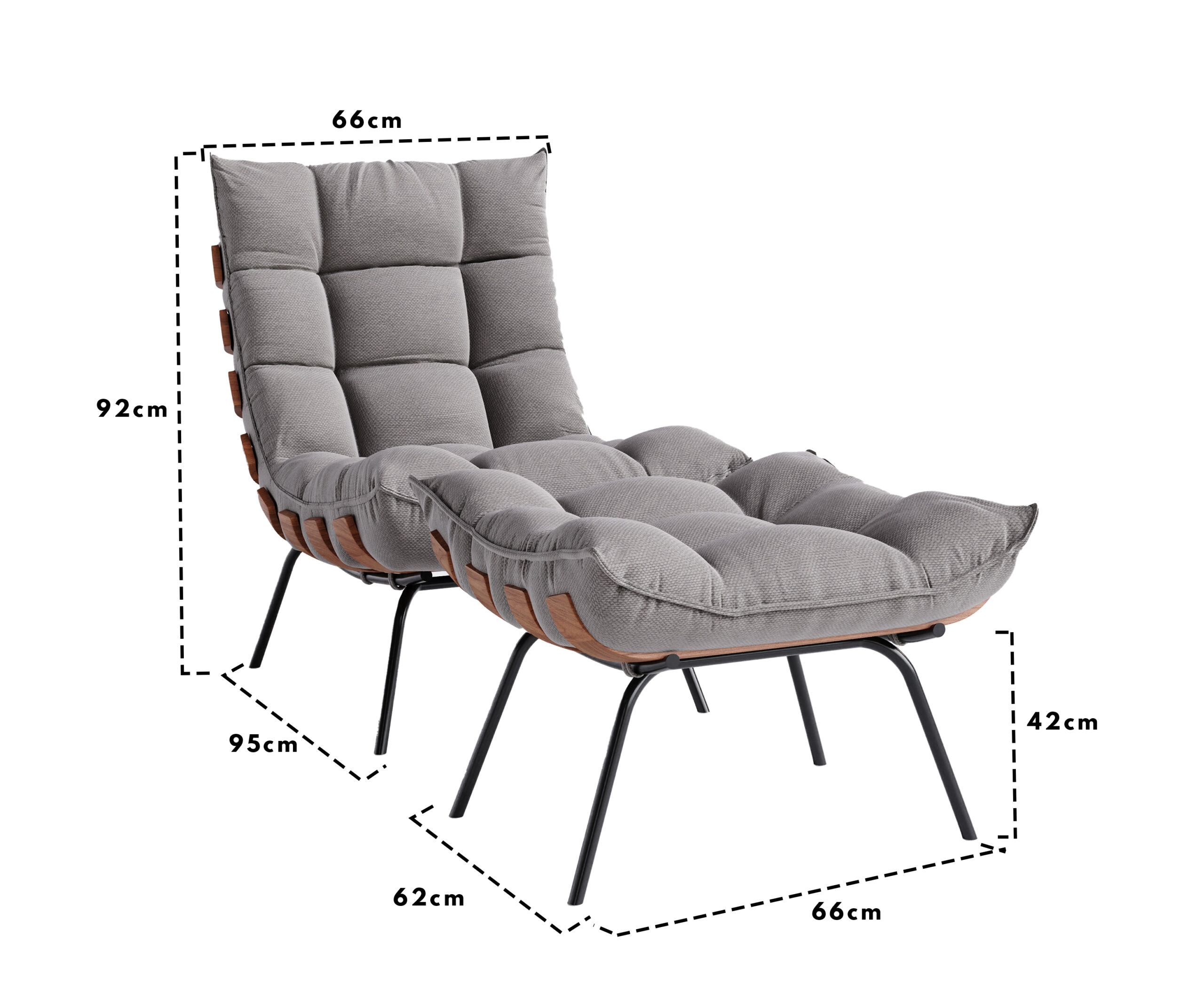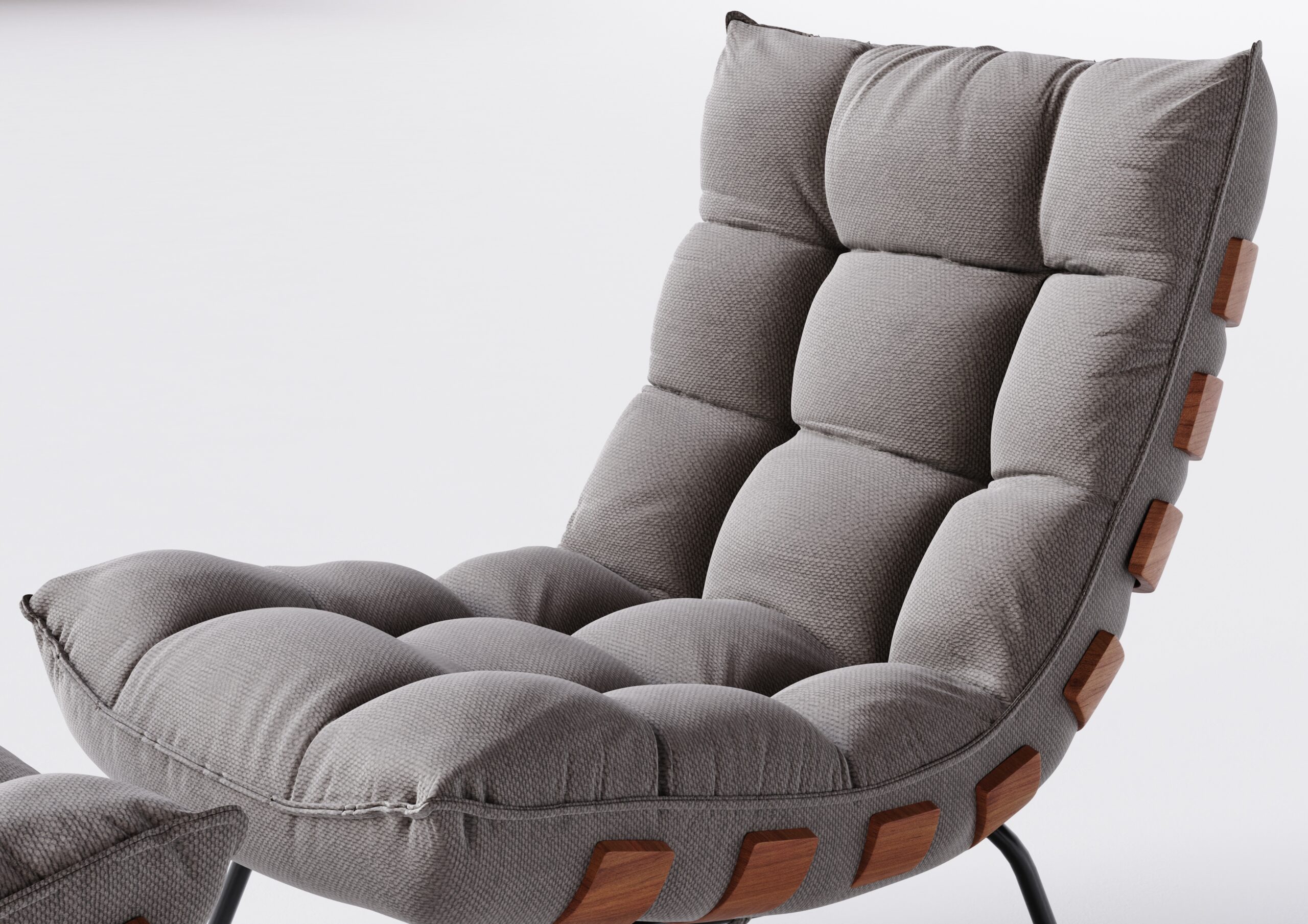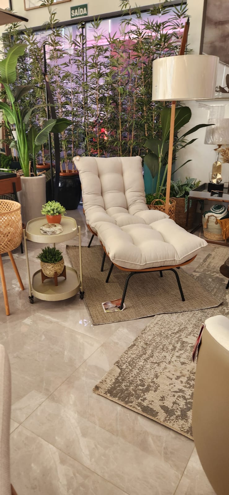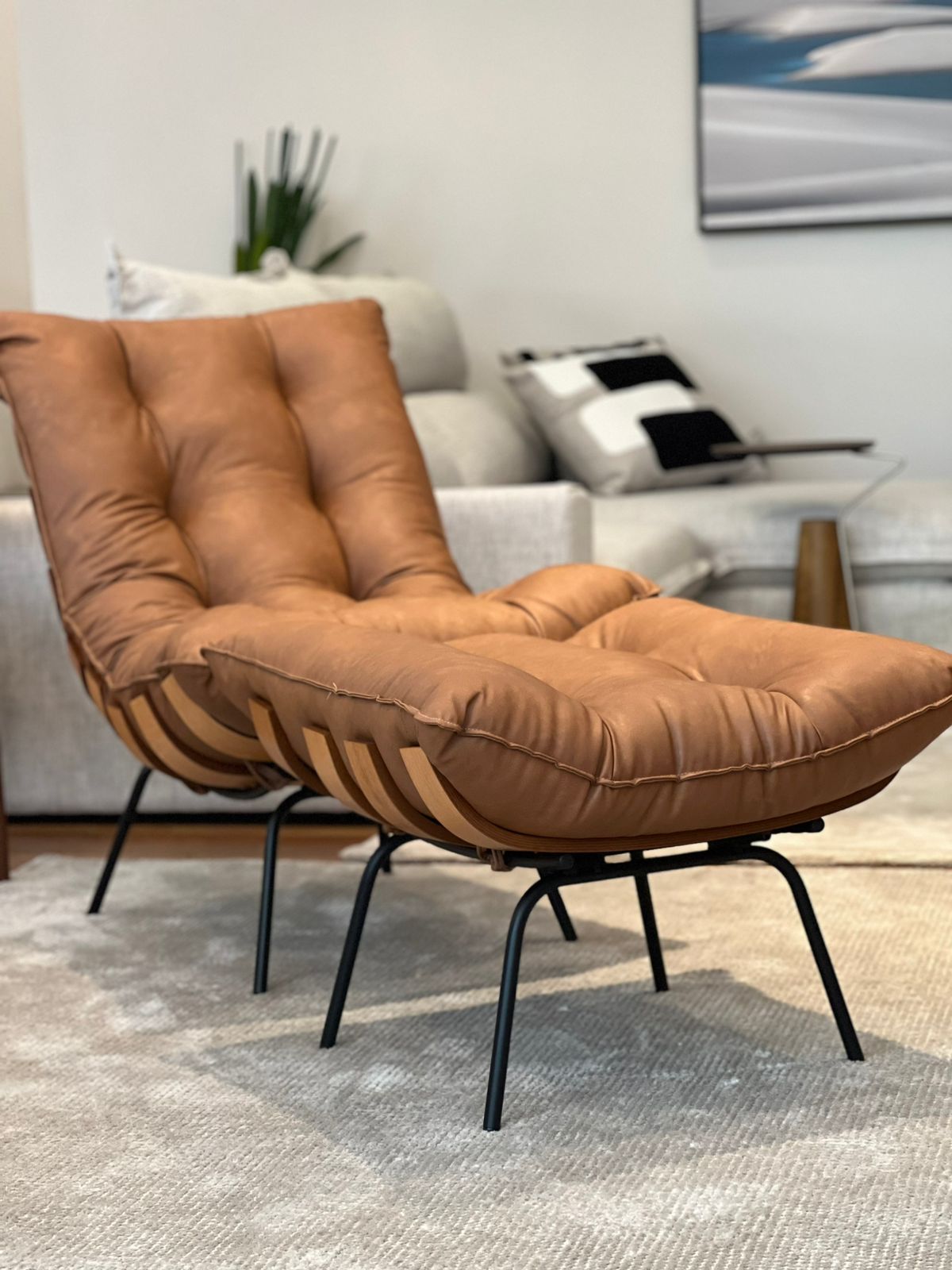 A Poltrona M06 é oferecida como um conjunto completo com Puff incluso, proporcionando apoio extra para descanso pleno.