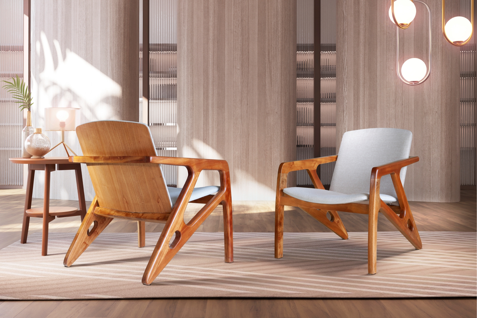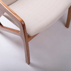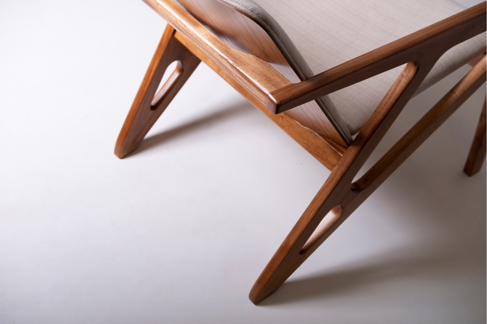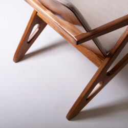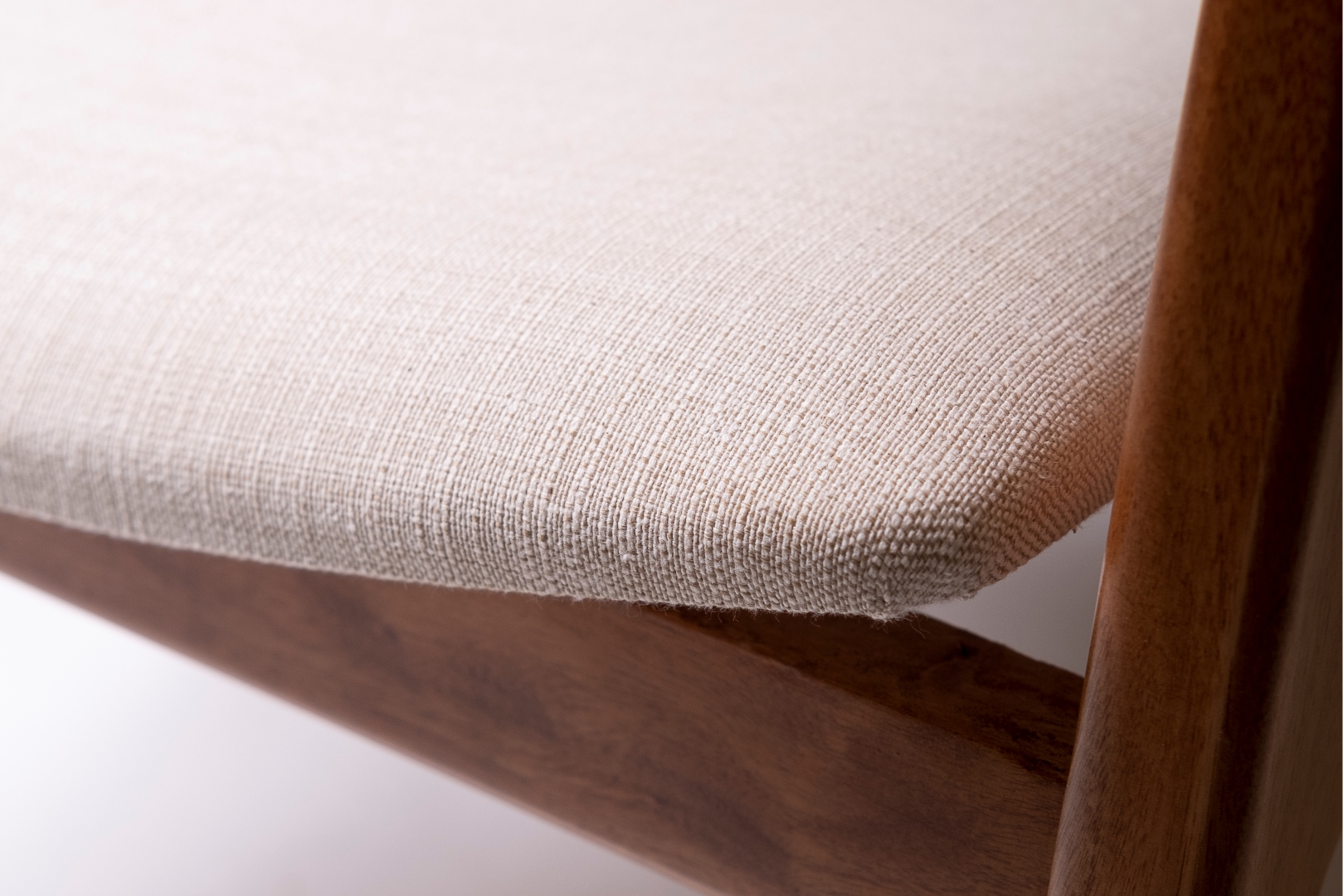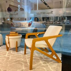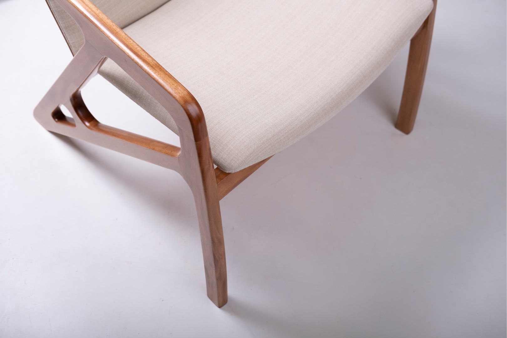 A Poltrona M08 combina a solidez estrutural com um design que valoriza a estética da madeira e o conforto: